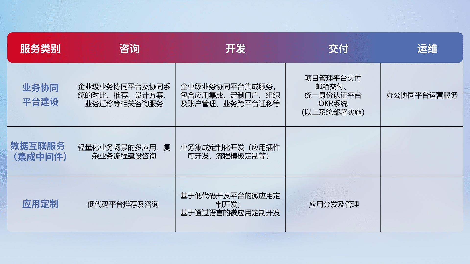 针对钉钉、、企微、、、、IDaas等平台级产品提供产品的规划、、、方案、、、交付、、、、定制化开发等服务,,实现如统一协同办公、、、、智能客户服务、、、混合会议管理、、、、智能数据查询、、、、等业务场景,,实现数字化转型。。